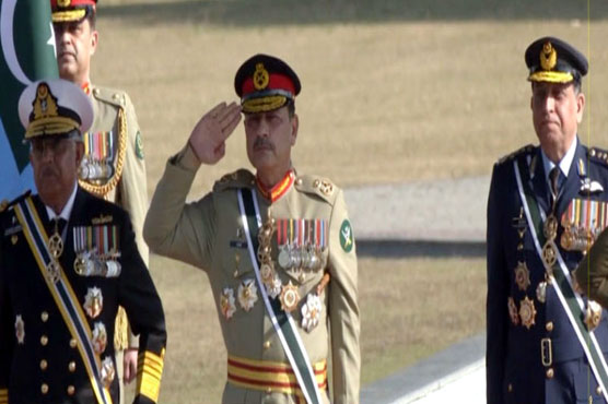 راولپنڈی: چیف آف ڈیفنس فورسز فیلڈ مارشل سید عاصم منیر کے اعزاز میں گارڈ آف آنر پیش کرنے کیلئے تقریب کا انعقاد کیا گیا۔جنرل ہیڈکوارٹرز (جی ایچ کیو) راولپنڈی میں منعقدہ پروقار تقریب میں فیلڈ مارشل سید عاصم منیر، نشان امتیاز (ملٹری)، ہلال جرات، چیف آف آرمی سٹاف و چیف آف ڈیفنس فورسز کو تینوں مسلح افواج کے دستے کی طرف سے گارڈ آف آنر پیش کیا گیا۔یہ تقریب بطور پاکستان کے پہلے چیف آف ڈیفنس فورسز تعینات ہونے پر فیلڈ مارشل سید عاصم منیر کے اعزاز میں منعقد کی گئی۔تقریب میں چیف آف دی نیول سٹاف ایڈمرل نوید اشرف اور چیف آف ایئر سٹاف، ایئر چیف مارشل ظہیر احمد بابر سدھو سمیت اعلیٰ عسکری افسران بھی شریک ہوئے، اعزازی دستہ کی جانب سے مہمان خصوصی کو جنرل سلامی پیش کی گئی، مہمان خصوصی فیلڈ مارشل سید عاصم منیر نے اعزازی دستے کا معائنہ بھی کیا۔